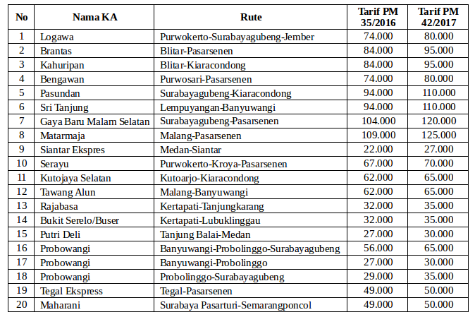 Berikut adalah mulai 1 januari 2018 tarif kereta api khusus yang ekonomi mengalami kenaikai, berikut daftar nya
